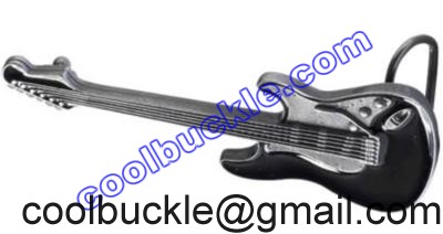 GUITAR CUTOUT PLAIN SILVER AND BLACK BELT BUCKLE. This buckle is 4 3/4 wide by 2 inches tall.