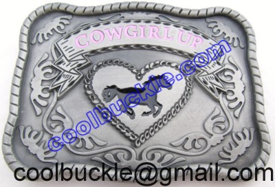 Cowgirl Up on gray frame with rope edges belt buckle.